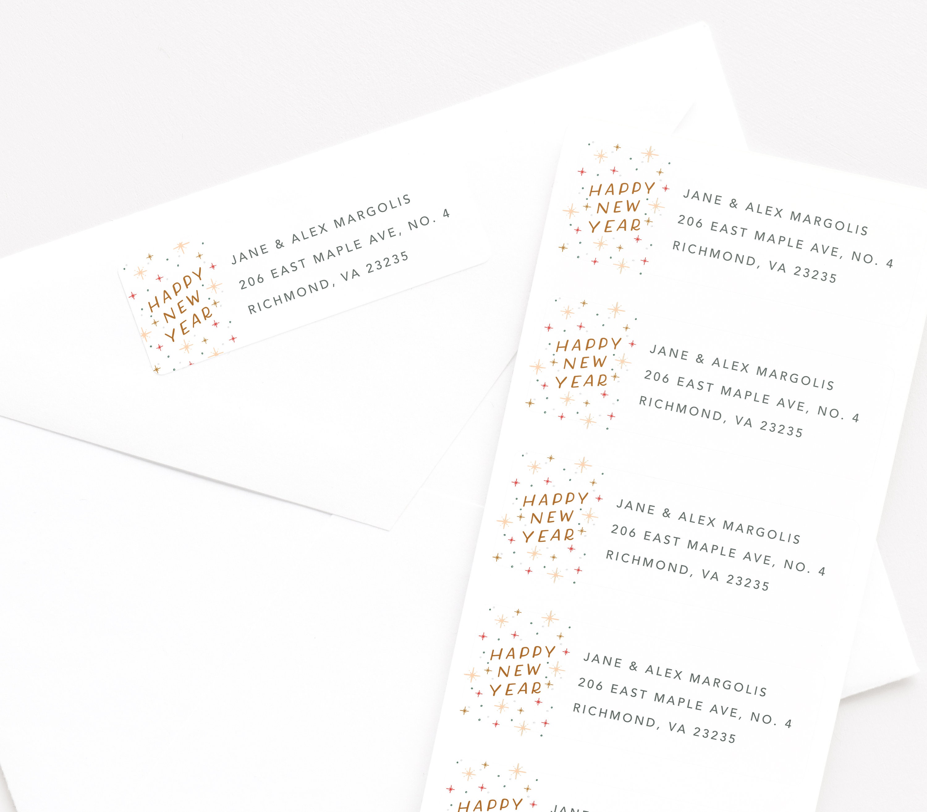 Modern New Year's Address Labels | Shutterfly What customers have to say about our New Year's Address Labels January 15, 2019 Thanks for the free Return Adress Labels! "I am very pleased with these labels! They look very nice and will come in handy! ... Address your envelopes with stylish return address labels. Corresponding invitations, gift tags and holiday cards are also available
